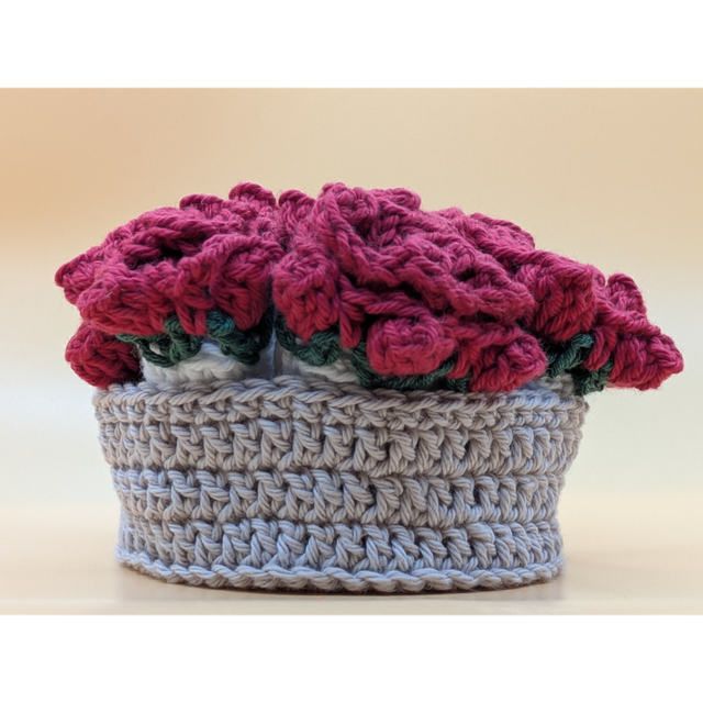 Hand crocheted by Allison, set of four coasters in a basket. Stored in the crocheted basket they appear as pretty floral bunches. Take them out of the basket and the bunches become coasters for your favourite brew. Perfect gift for occasions like valentine or mothers day or just as everyday functional table decoration.