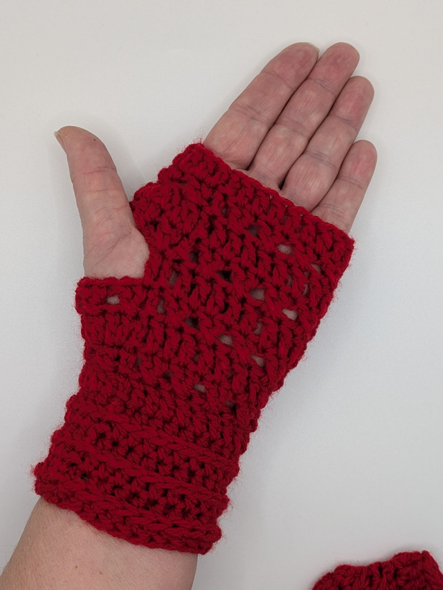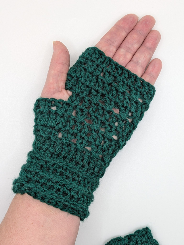 One size fits all, adult fingerless acrylic mittens hand crocheted by Allison. This design keeps your hands warm but gives you the freedom to type, scroll, write etc.